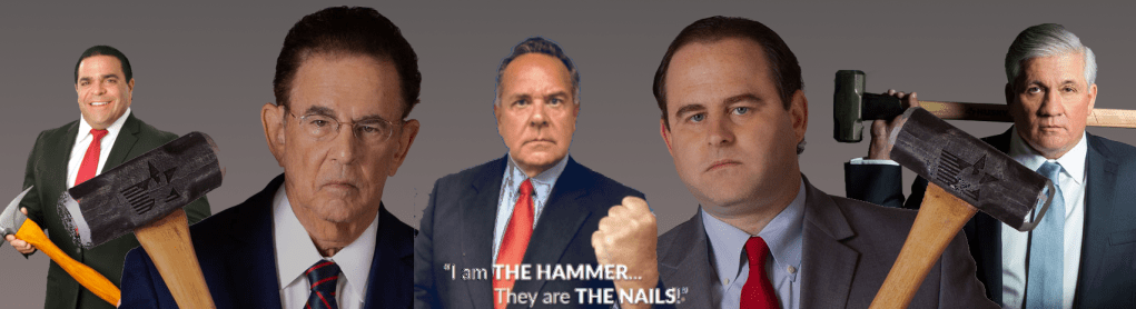 This trend of aggressive advertising can also be found in television ads. I believe that the use of the hammer is due to the convergence of these factors, and it is a very common symbol of the legal profession. From my research, which has been hampered by the fact that I am trying to investigate advertising, it seems like one of the first lawyers to adopt this strategy was Lowell “The Hammer” Stanley. I found a TV ad from as early as 2006, possibly earlier, that showcases him using that nickname on on YouTube.