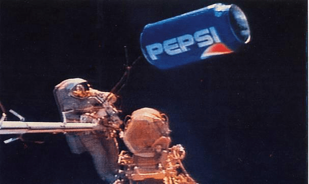 The space advertising satellites mentioned earlier might seem far-fetched, but there have been more limited space advertisements: promotional research on the ISS like the Hilton cookie baking experiment or sponsored whiskey aging stunts, the giant Pepsi can floated outside of Mir, and the Pizza Hut ads on the sides of Soyuz Rockets. Unlike NASA, Russia’s Roscosmos has no prohibitions against working with commercial actors.
