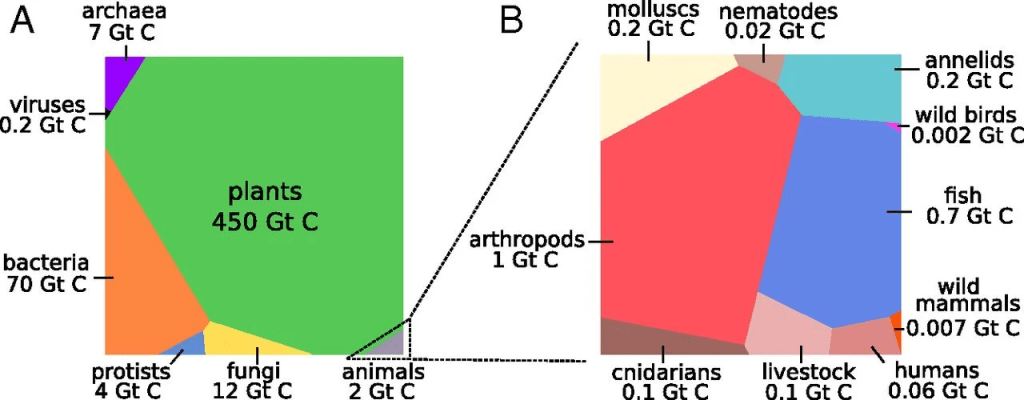 There have been a lot of science fiction discussions about what the structure of such a planet would look like or what the total population count would be, and I’ve seen numbers ranging from the hundreds of billions to the quadrillions depending on how food is produced and (most importantly) where energy comes from. I don’t want to get bogged down in the weeds of those discussions, and instead I think it is best to focus on the relative biomasses of the components.